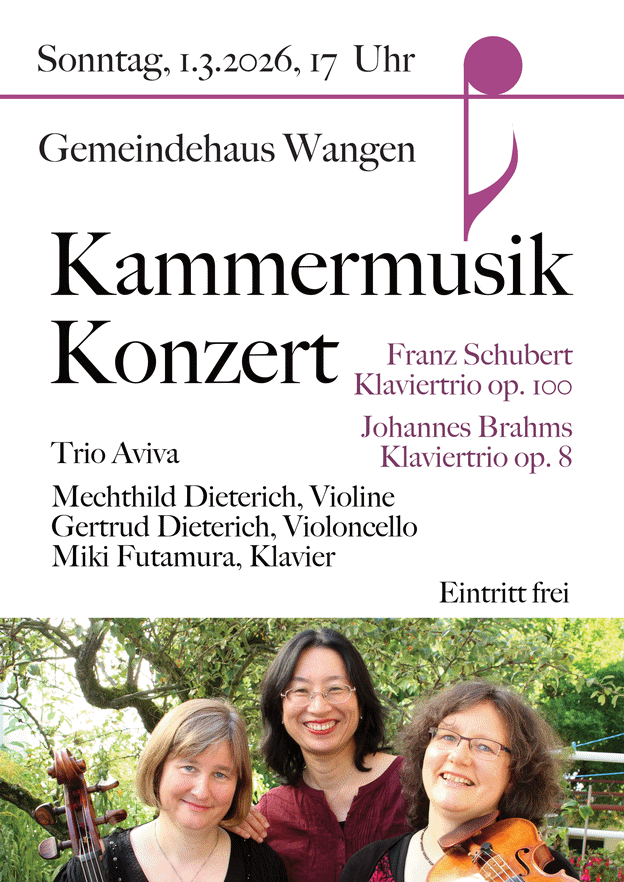 Stuttgart-Wangen … Am Sonntag, 1. März, findet im evangelischen Gemeindehaus in Wangen wieder ein Kammermusikkonzert mit dem Trio AVIVA aus Stuttgart statt (17 Uhr: Ulmer Str. 347A).