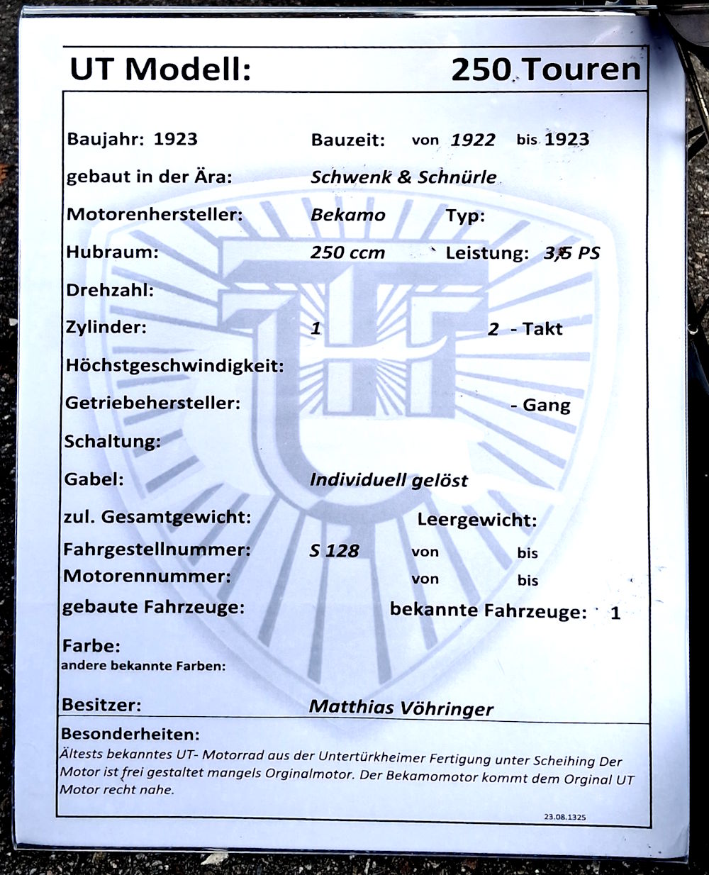 Jahre stattfindendes, internationales Clubtreffen zu feiern. Erwartet werden bei demTreffen etwa 40 Fahrzeuge aus der Zeit der Anfänge der UT in den 1920er Jahren bis zum letzten Prototyp aus den 1950er. Viele der Maschinen wurden liebevoll restauriert und individuell umgebaut. Die Fahrzeuge werden an beiden Tagen jeweils zwischen 10 Uhr und 16 Uhr ausgestellt.
