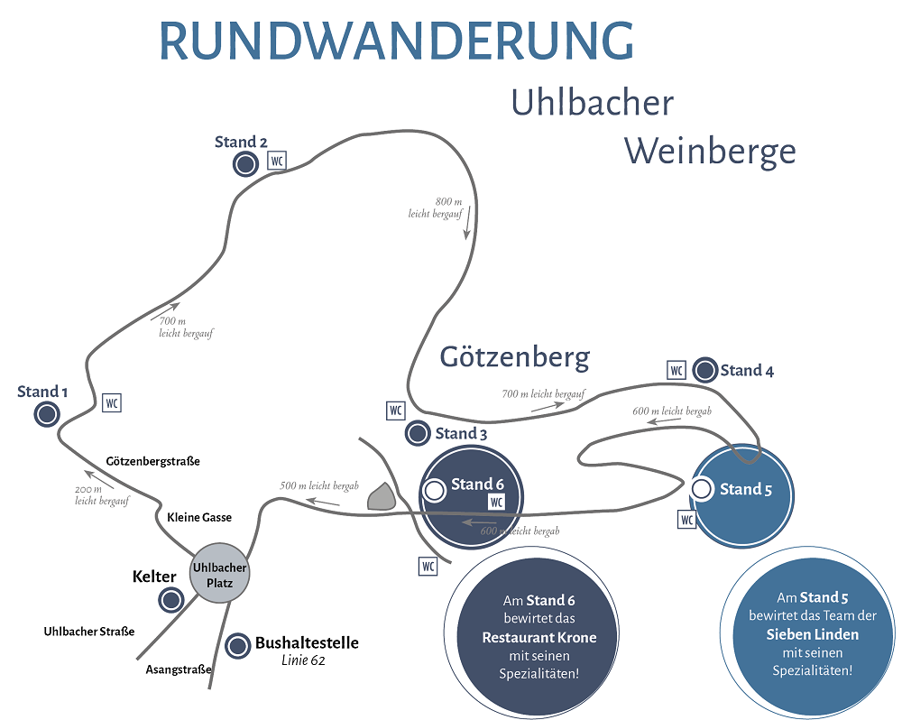 Die offene Wanderrunde startet traditionell am Uhlbacher Platz in Uhlbach – allerdings dürfen Sie selbstverständlich auch an jedem anderen Punkt starten. Von hier beginnt die wunderschöne Wanderung zunächst bergauf durch die Weinberge rund um den Götzenberg, einer unserer besten Weinbergslagen. An sechs Stationen mit unterschiedlichen Weinschwerpunkten können Sie unsere Weine verkosten und werden mit kulinarischen Spezialitäten zum Verweilen an teils beschatteten Biertischgarnituren eingeladen. Genießen Sie Ihren Lieblingswein mit herrlichem Blick auf Uhlbach, die Grabkapelle und den bereits heranwachsenden neuen Jahrgang. Ein Quereinstieg ist überall möglich, die Gläserrückgabe findet allerdings nur an Stand 6 statt.