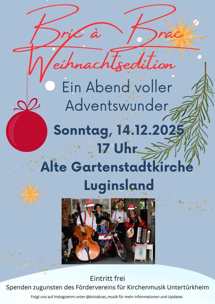 semble Bric à Brac lädt ein zu einer Weih nachtsedition voller Klänge und Texte, gesammelt wie bunte Schätze vom Flohmarkt aus aller Welt. Mal leise und besinnlich, mal heiter und mit einem Augenzwinkern, mal zum Lauschen, mal zum Mitsingen – ein Abend voller kleiner Wunder, liebevoll für euch zusammengestellt.