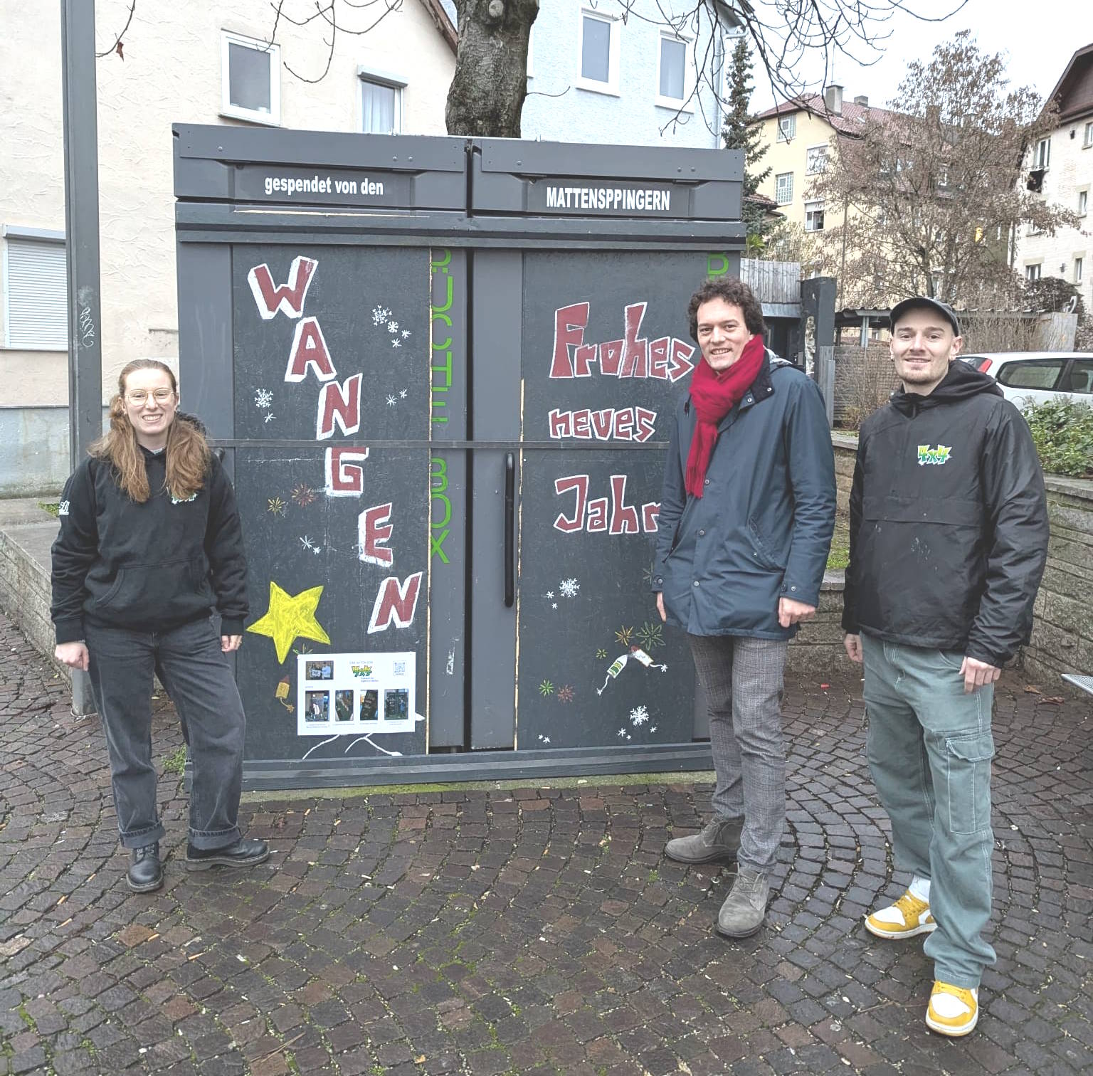 Das 4×4 Team der Stuttgarter Jugendhausgesellschaft hat auf Initiative des Bezirksamts Wangen den Bücherschrank am Wangener Marktplatz erneut abgesichert. Dies ist eine Lehre aus dem Vandalismus in den vorvergangenen Jahren. Mit der Absicherung sind die Bücher über den Jahreswechsel zwar nicht zugänglich, die Bücherhütte aber wird nicht zerstört. Bezirksvorsteher Jakob Bubenheimer hat sich vor Ort bei Selina Müller und Jakob Schölkopf, den Mitarbeiter*innen des 4×4 Team, bedankt. Das 4×4 Team ist über das ganze Jahr mit hinausreichender Jugendarbeit im öffentlichen Raum in den oberen Neckarvororten unterwegs. Bezirksvorsteher Bubenheimer hofft auf ein entspanntes und möglichst schadensfreies Silvesterfest in Wangen“.