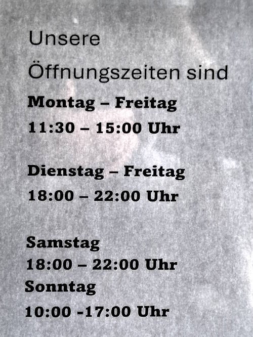 Kommt vorbei und entdeckt den Geschmack des Libanon. ——————————————— Mittagstisch: Montag bis Freitag von 11:30 bis 15:00 Uhr Abendessen:,Dienstag bis Samstag von 18:00 bis 22:00 Uhr Sonntags: Brunch / Frühstück (International) 10:00 bis 17:00 Uhr