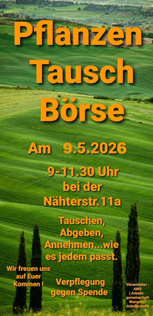 Die Arbeitsgemeinschaft Wangener Grünflächen (AWG) veranstaltet am Samstag, den 9.5.2026 von 09.00 bis 11.30 Uhr eine Pflanzenverschenke bei Nähterstraße 11 a.