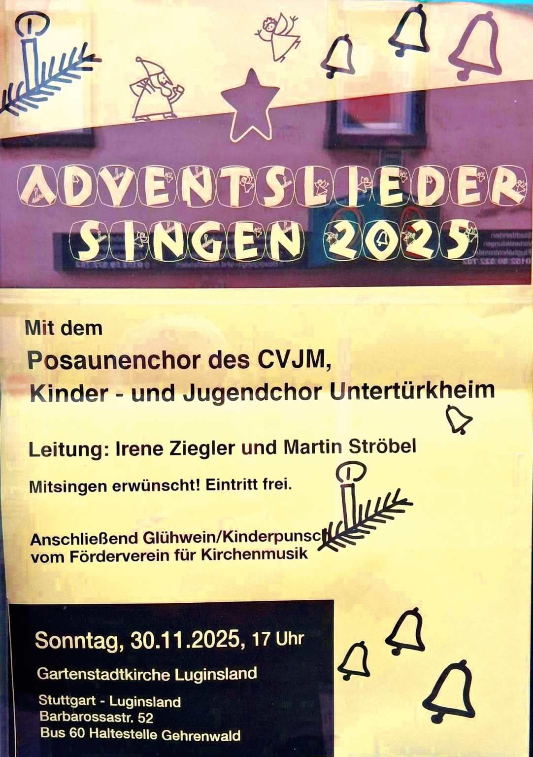 Untertürkheim Gartenstadtkirche: ADVENTSLIEDERSINGEN Sonntag, 30.11.2025, 17 Uhr 18. November 2025 En ADVENTSLIEDERSINGEN am Sonntag, 30.11.2025, 17 Uhr Gartenstadtkirche Luginsland Posaunenchor, Kinder- und Jugendchor Anschließend Glühwein/Kinderpunsch vom Förderverein für Kirchenmusik