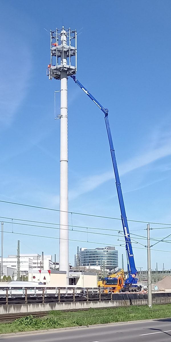 Am 41 Meter hohen Funkturm der Bahn im Abstellbahnhof wird zur Zeit die Funktechnik installiert.