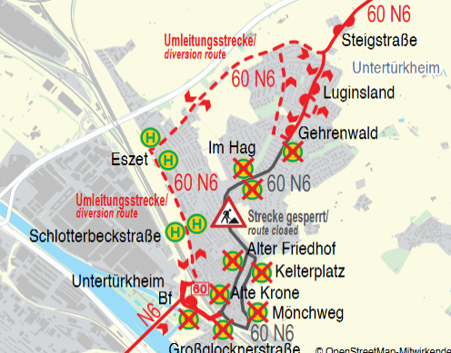 In Fahrtrichtung Untertürkheim Bahnhof können die Haltestellen Im Hag, Untertürkheim Alter Friedhof und Alte Krone nicht bedient werden.