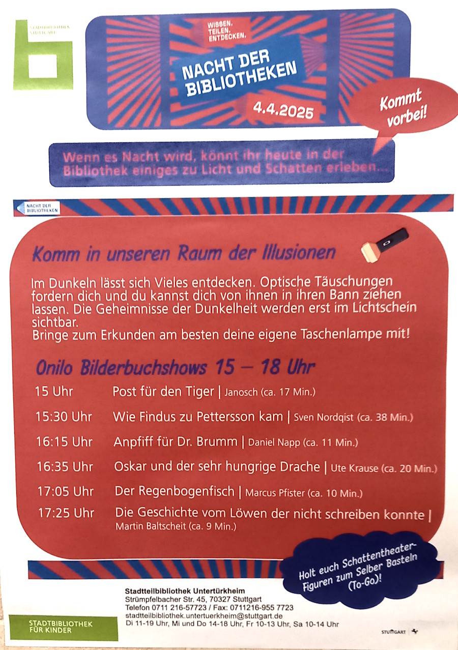 Wenn es Nacht wird, könnt ihr heute in der Bibliothek einiges zu Licht und Schatten erleben. Vielleicht hast du Lust deine eigenen Schattentheater-Figuren zu basteln, rätselhafte Täuschungen zu entschlüsseln oder es dir beim Bilderbuchkino gemütlich zu machen. Dann komm vorbei, wir freuen uns auf dich!