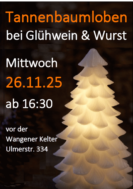 Das traditionelle Tannenbaum-loben findet in diesem Jahr am Mittwoch, den 26. November 2025, ab 16.30 Uhr vor der Wangener Kelter in der Ulmer Str. 334, 70327 Stuttgart-Wangen statt.